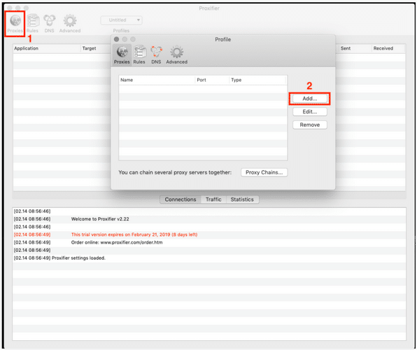 - Add proxies. Click on Proxies (1). Click Add(2).