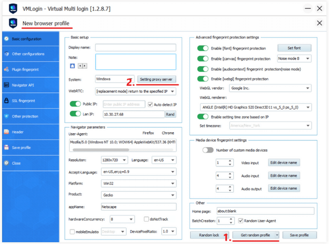 - Launch VMLogin and create a new browser profile. You can either click Get random profile (1), or select your settings.